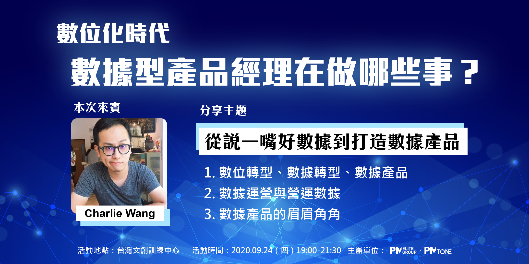 本次【產品經理菁英會社團暨PM Tone產品通】的分享主題將聚焦於【如何做好數據產品經理的角色】,邀請到的來賓是目前任職於Vpon擔任數據分析師 Charlie Wang。Charlie 是從數據分析中接觸到產品經理的角色,更擅長用數據做為解決問題的工具。
